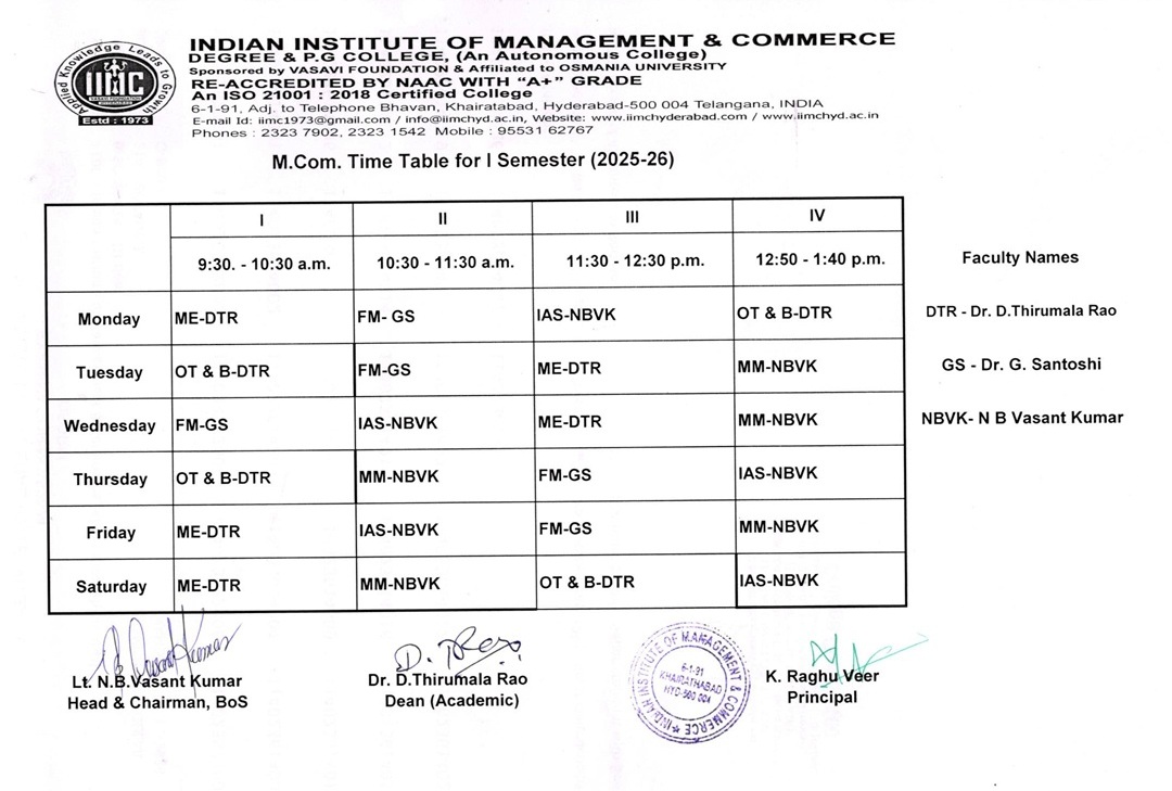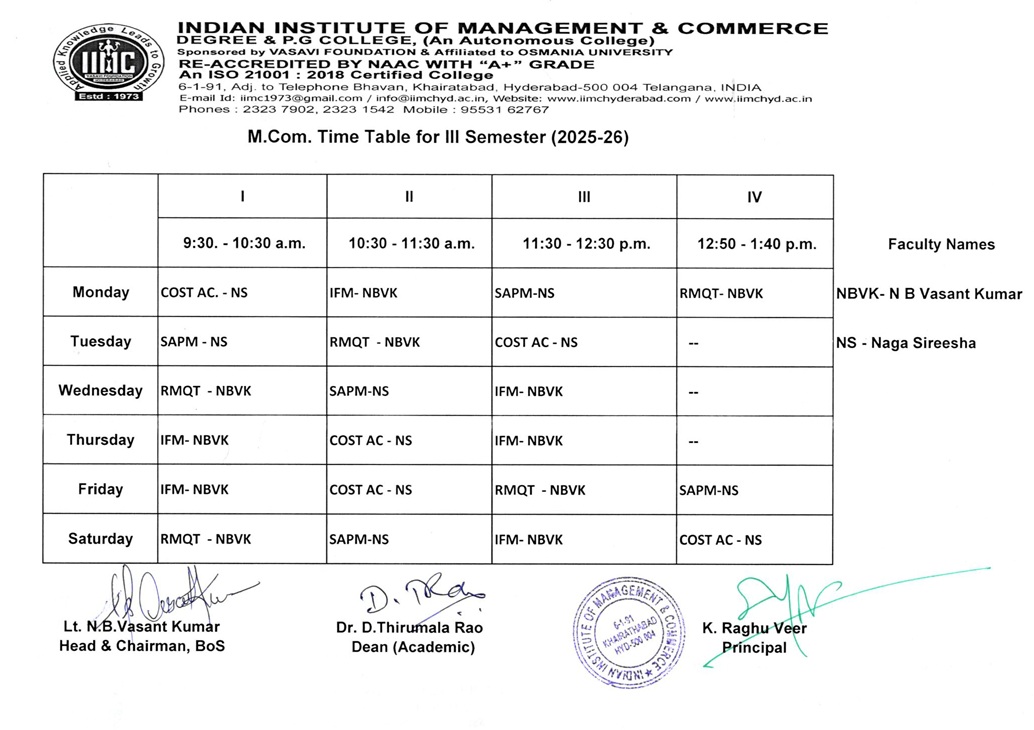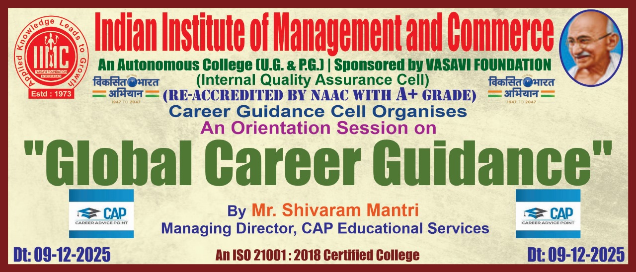 The Indian Institute of Management and Commerce(IIMC) established five decades ago(year 1973) has to its credit some outstanding achievements in the field of Commerce Education in general and Honours course in particular at the Degree level. Eminent social workers and philanthropists and Educationalists like Sri Kothuru Seethaiah Gupta, Sri Challa Som Raj Ram, Sri C.E. Gupta, Sri Dundoo Balanarasaiah, Sri Narayana Chetty IAS(Retd.), Late Sri Veloor Lingaiah Gupta gathered together and laid solid foundation in starting this premier Institution. Members of Vysya Community in particular and admirers of Higher Education in general are greatly beholden to the Founders.