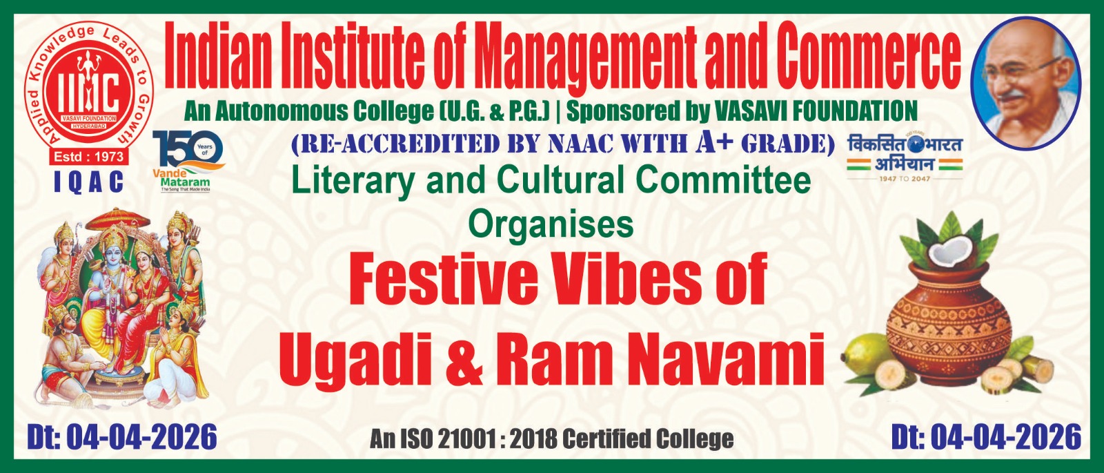 The Indian Institute of Management and Commerce(IIMC) established five decades ago(year 1973) has to its credit some outstanding achievements in the field of Commerce Education in general and Honours course in particular at the Degree level. Eminent social workers and philanthropists and Educationalists like Sri Kothuru Seethaiah Gupta, Sri Challa Som Raj Ram, Sri C.E. Gupta, Sri Dundoo Balanarasaiah, Sri Narayana Chetty IAS(Retd.), Late Sri Veloor Lingaiah Gupta gathered together and laid solid foundation in starting this premier Institution. Members of Vysya Community in particular and admirers of Higher Education in general are greatly beholden to the Founders.