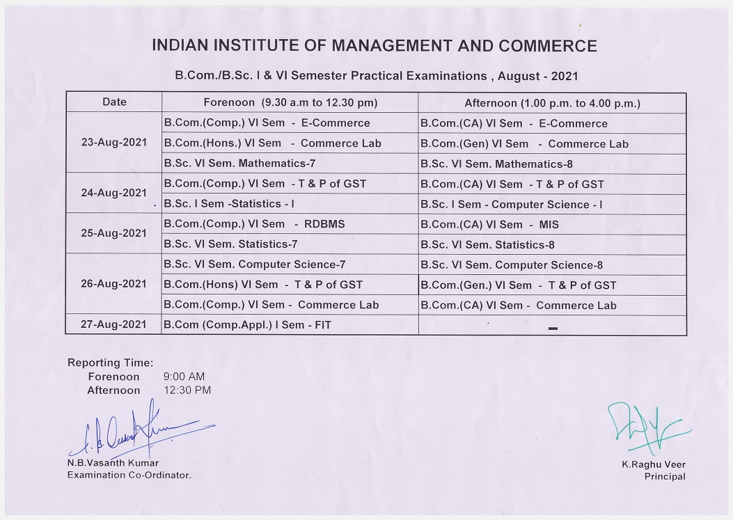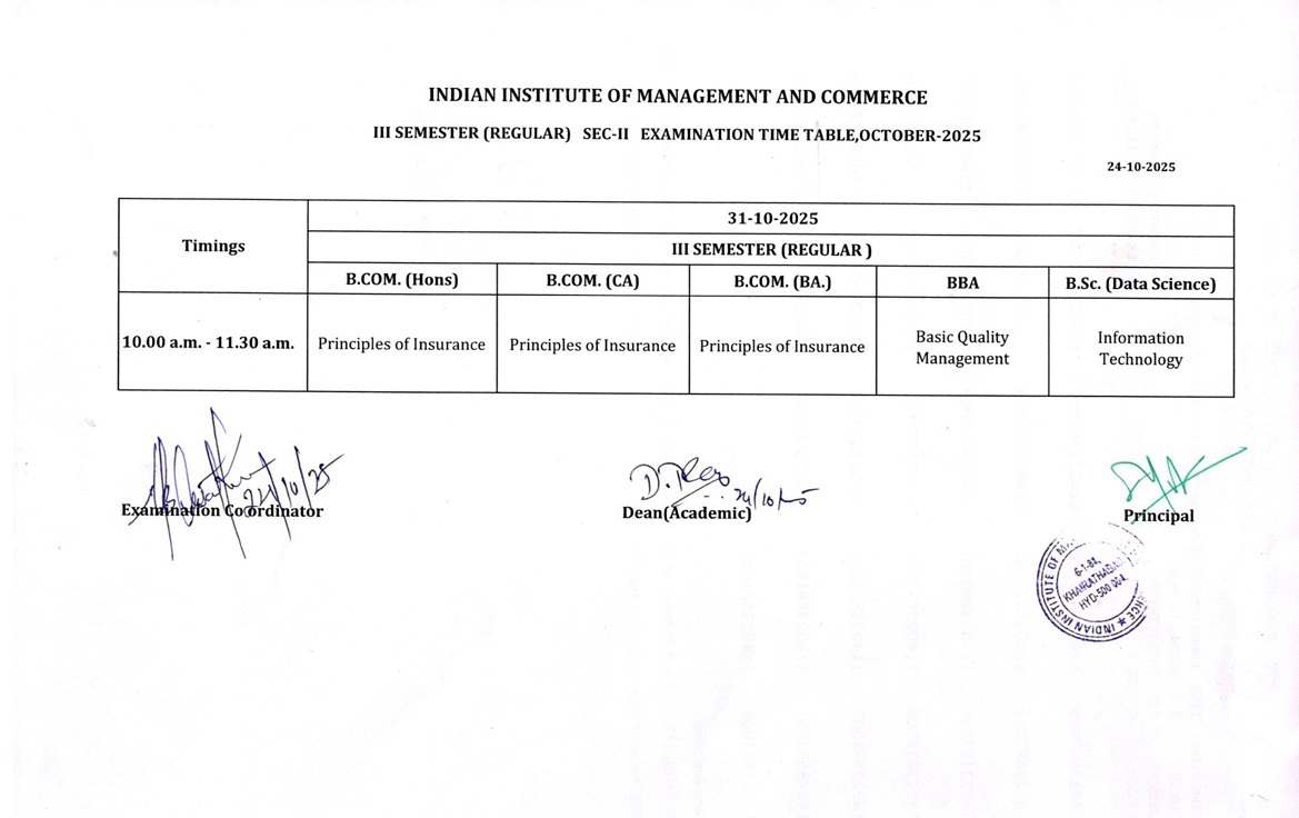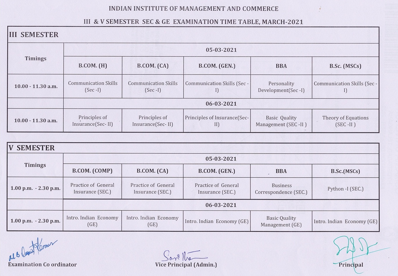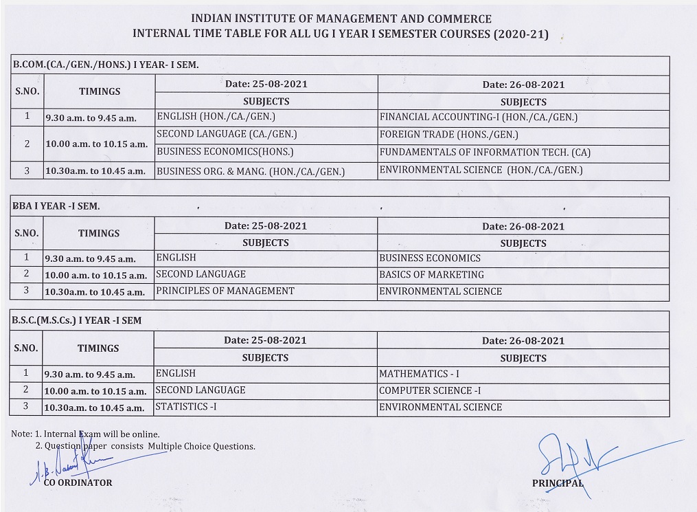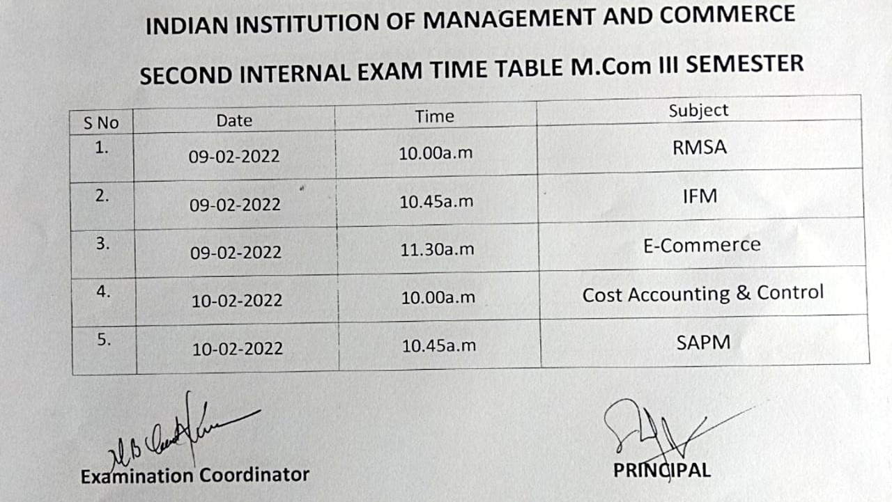 B.Com. & B.Sc. III SEM Internal Exam Time Table