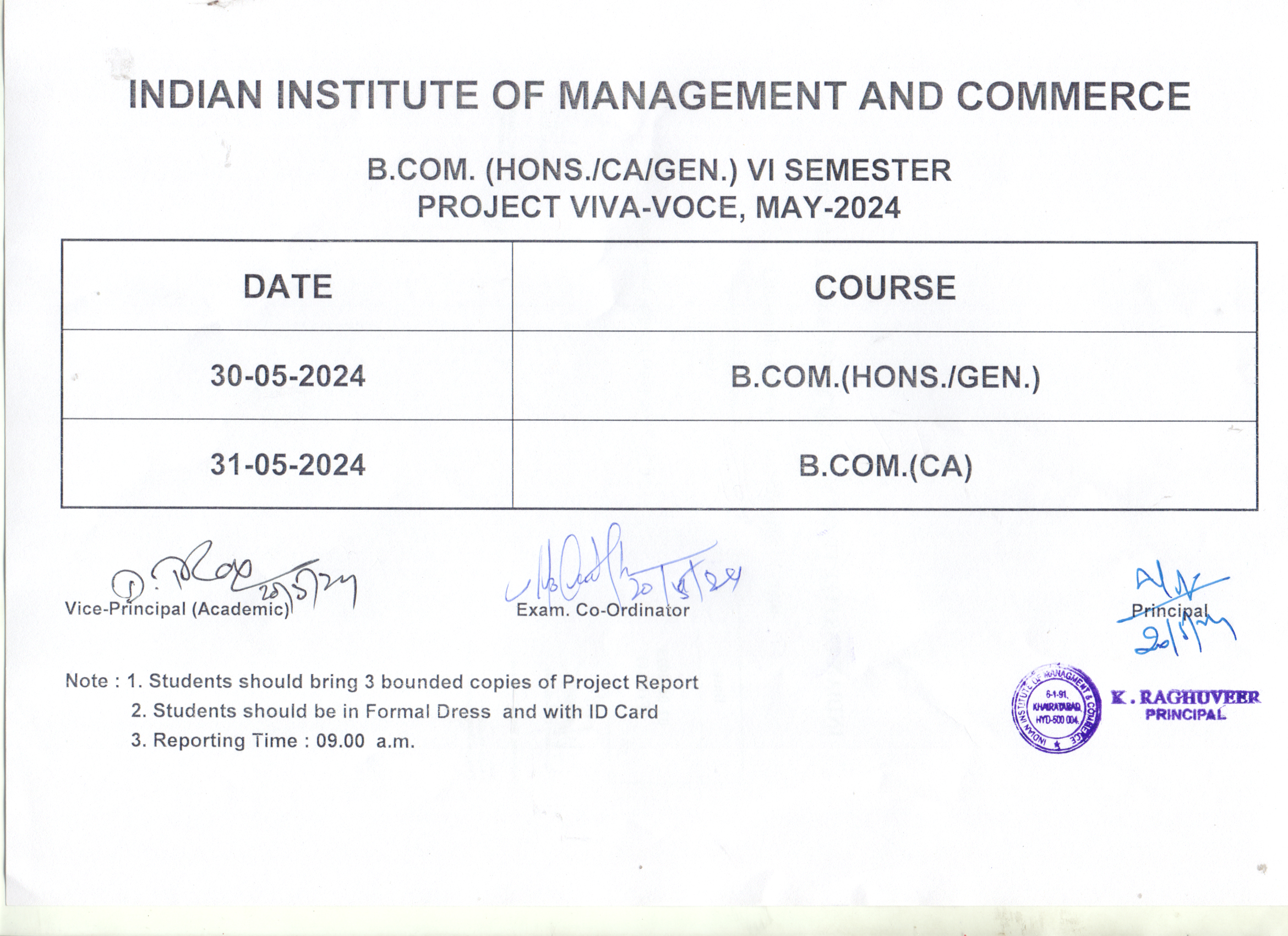 B.Com.(Hons/Gen/C.A.) Project Viva Timetable(30-May-2024 & 31-May-2024)