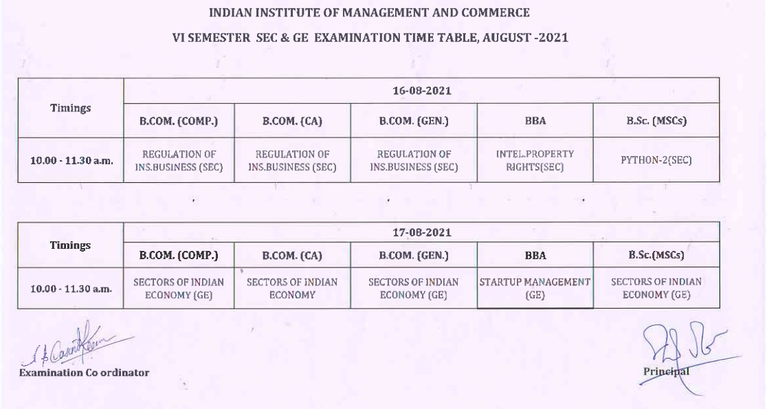 UG VI SEM - SEC & GE EXAMS Timetable(16-Aug-2021 & 17-Aug-2021)