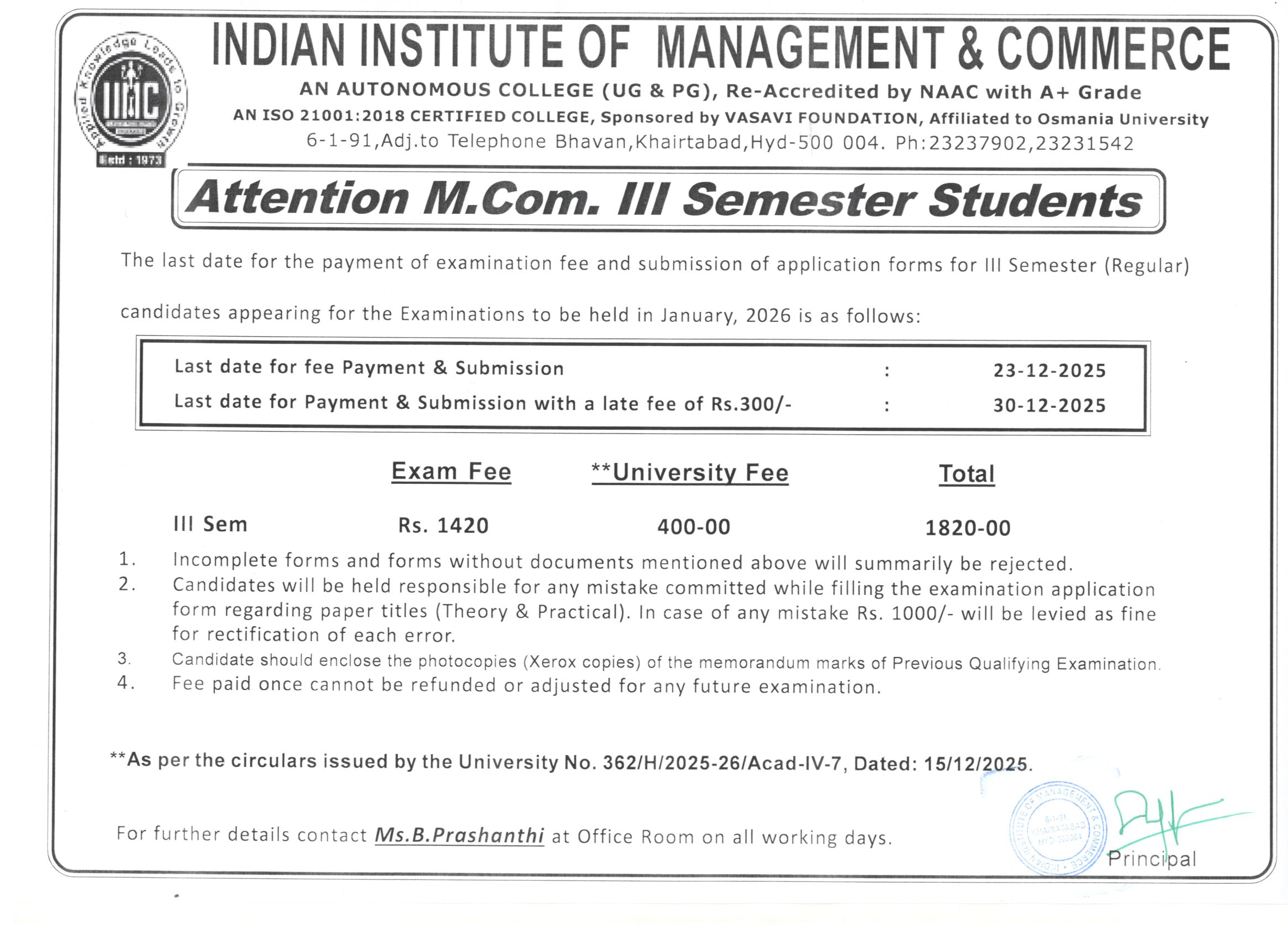 M.Com. III Semester Examination Fee Notice (Last Date:23-Dec-2025)