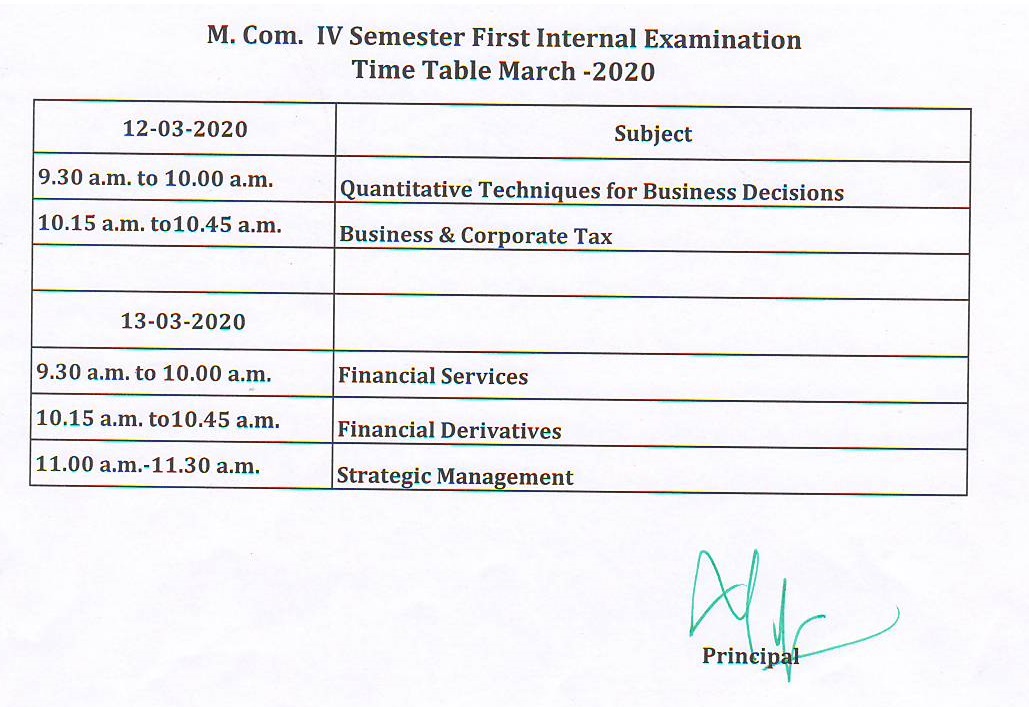 M.Com IV Sem. First Internal Timetable - Mar 2020