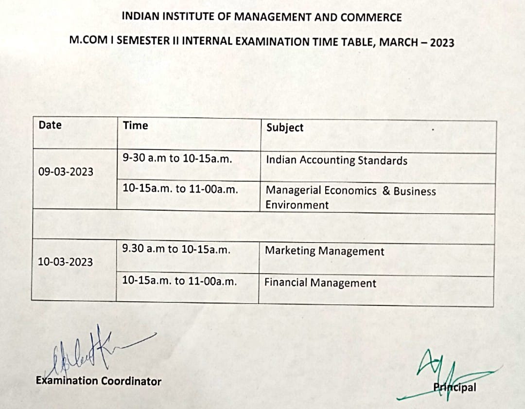 MCom I Sem II Internal Timetable (9-Mar-2023 & 10-Mar-2023)