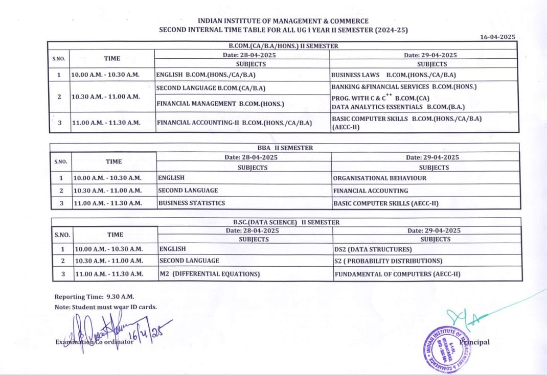 UG II Sem - Second Internal Timetable (28-Apr-2025 & 29-Apr-2025)