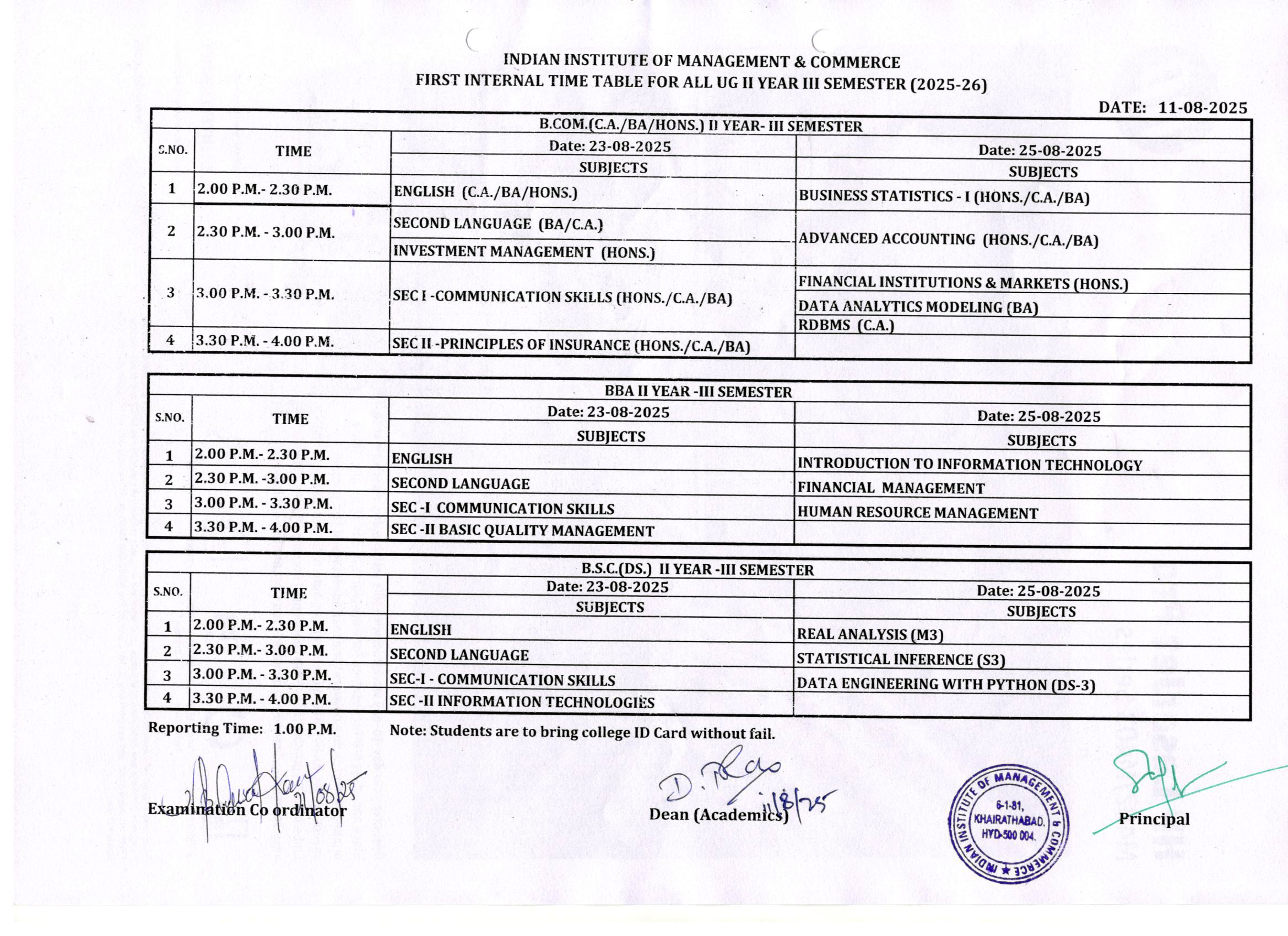 UG III Sem-First Internal Exams (23-Aug-2025 & 25-Aug-2025)
