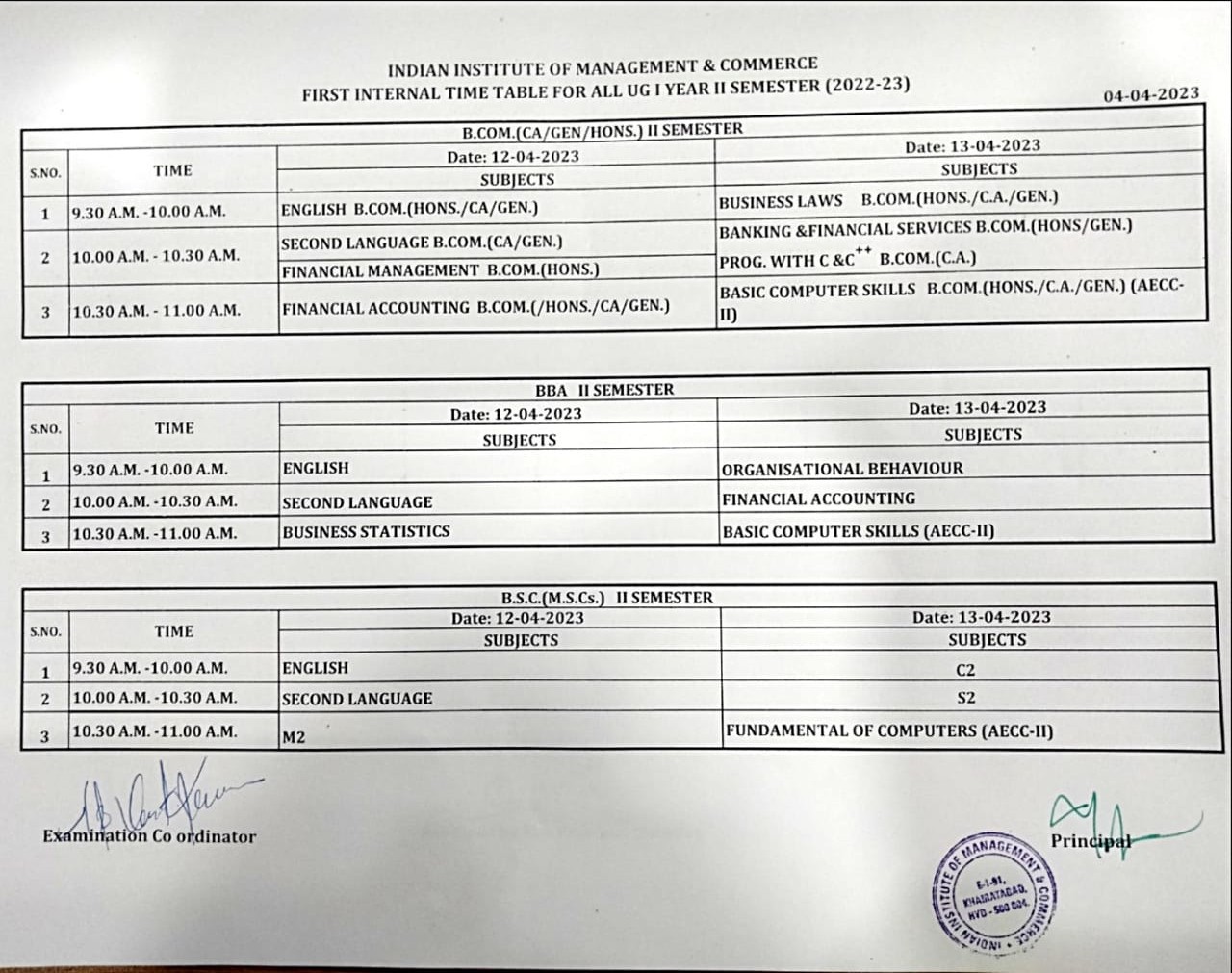 UG II Sem.-I Internal Exam Timetable (12-Apr-2023 & 13-Apr-2023)