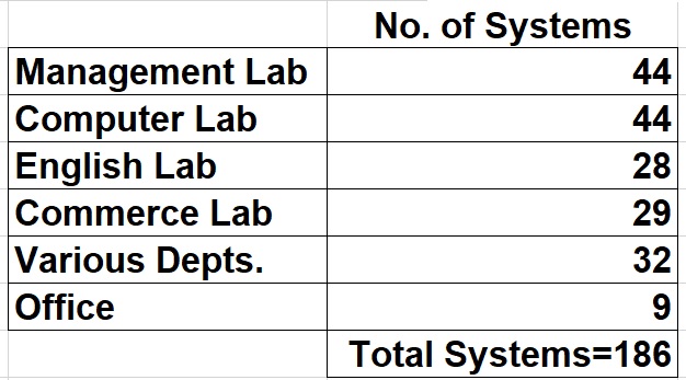 The college has a computer lab, commerce lab, english lab and management lab with LCD projectors. Every Lab computers with networking facility and 100 Mbps internet connection with wifi, is available with 2 hours UPS back up for the convenience of students and faculty.