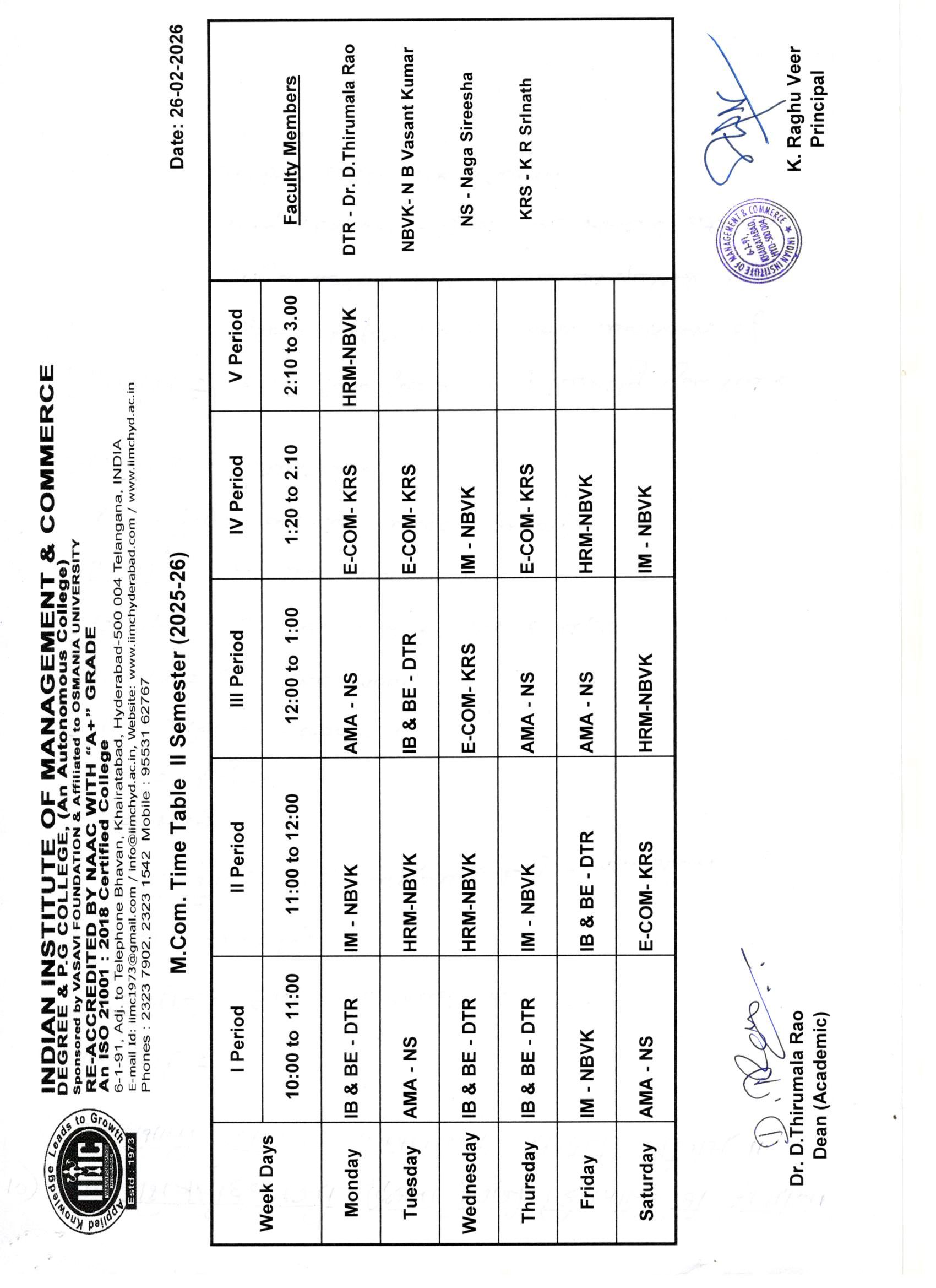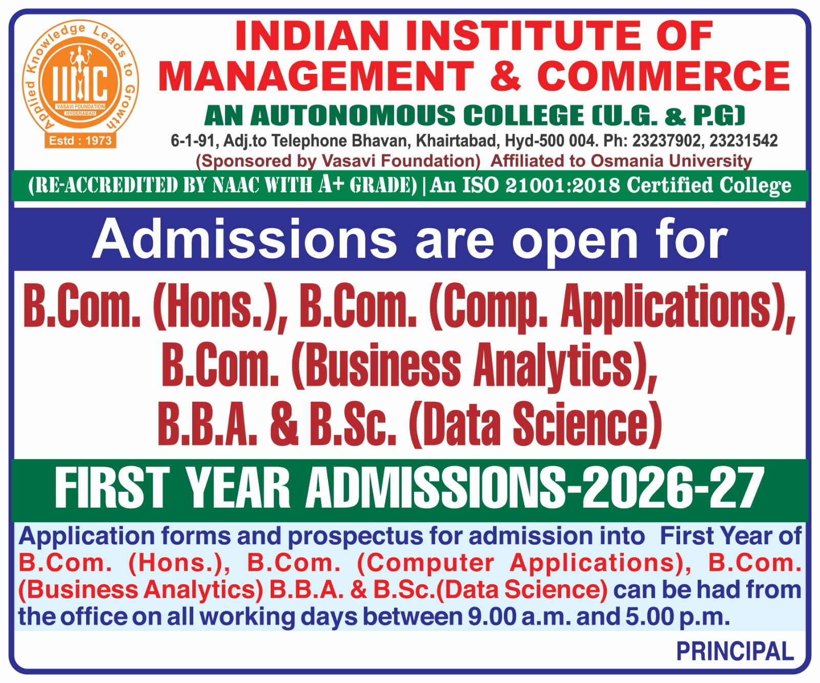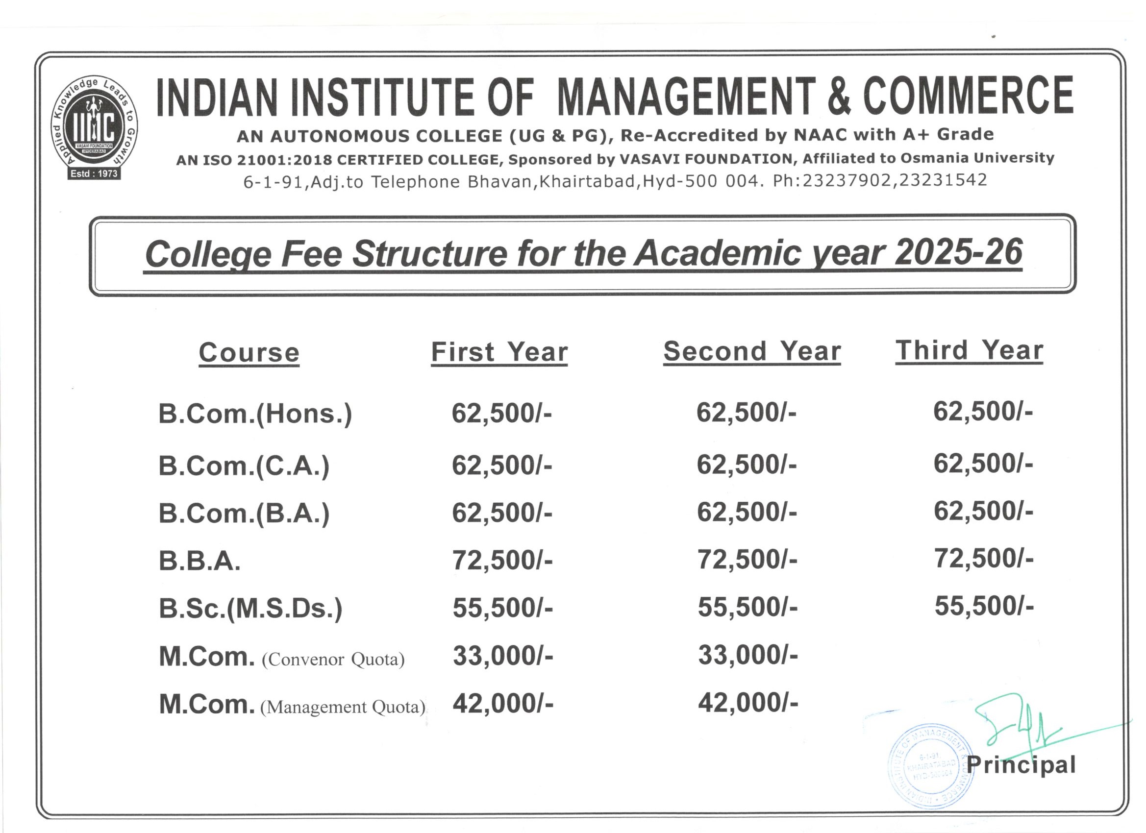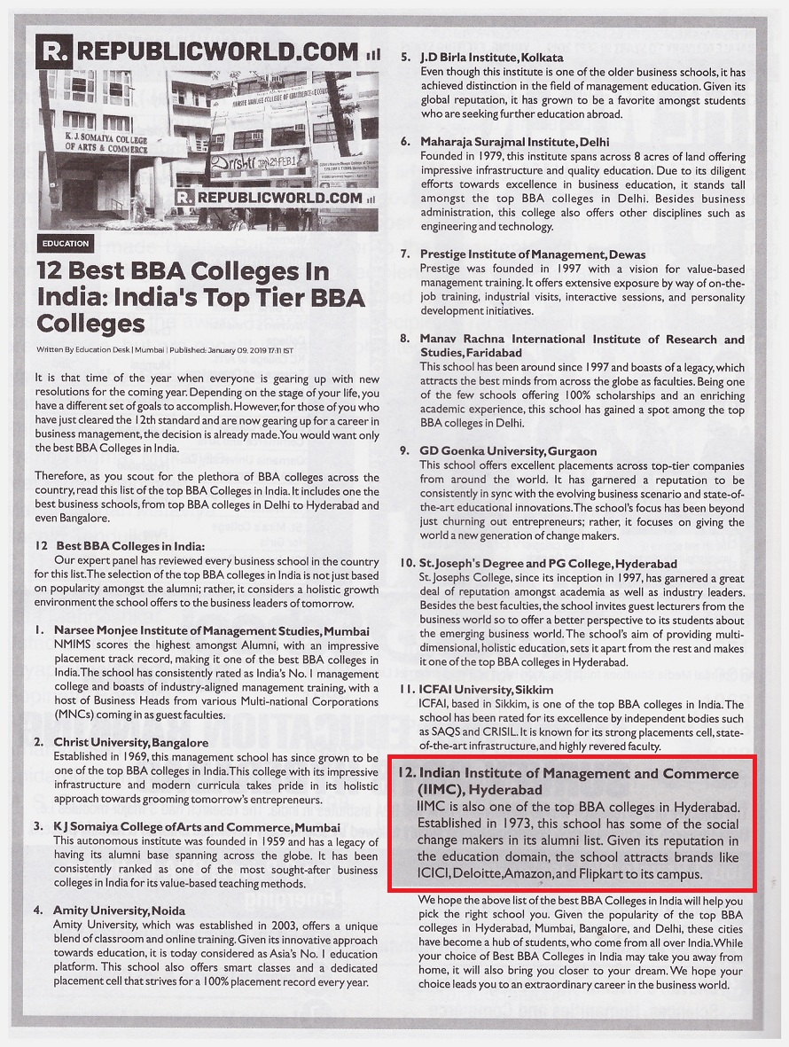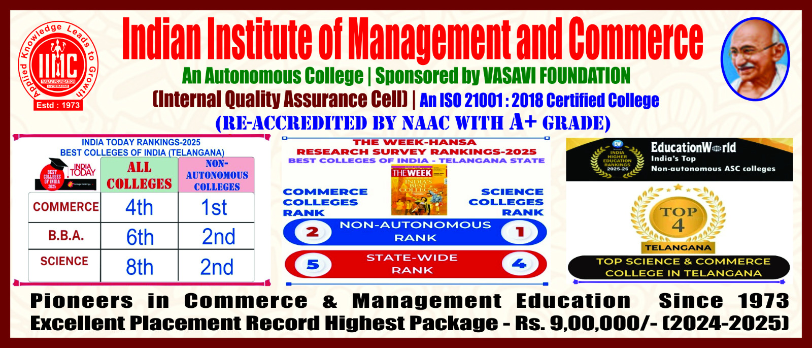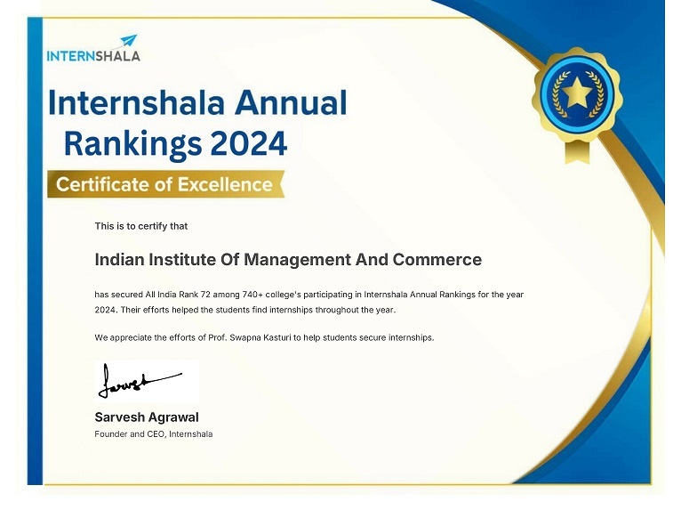 The Indian Institute of Management and Commerce(IIMC) established five decades ago(year 1973) has to its credit some outstanding achievements in the field of Commerce Education in general and Honours course in particular at the Degree level. Eminent social workers and philanthropists and Educationalists like Sri Kothuru Seethaiah Gupta, Sri Challa Som Raj Ram, Sri C.E. Gupta, Sri Dundoo Balanarasaiah, Sri Narayana Chetty IAS(Retd.), Late Sri Veloor Lingaiah Gupta gathered together and laid solid foundation in starting this premier Institution. Members of Vysya Community in particular and admirers of Higher Education in general are greatly beholden to the Founders.