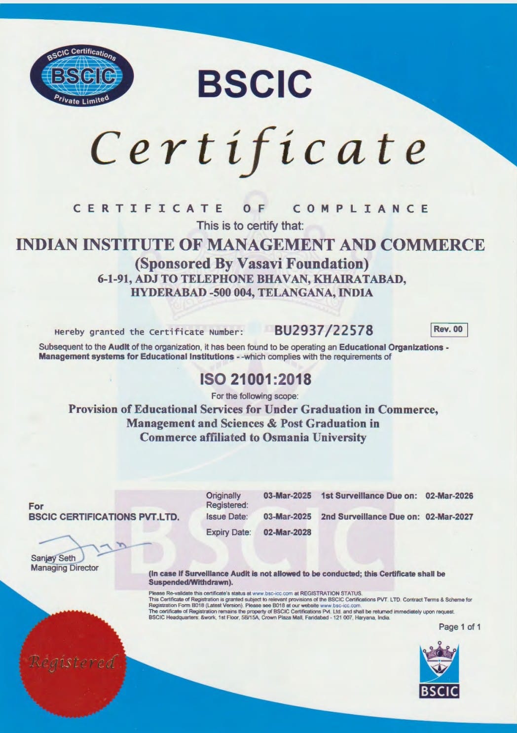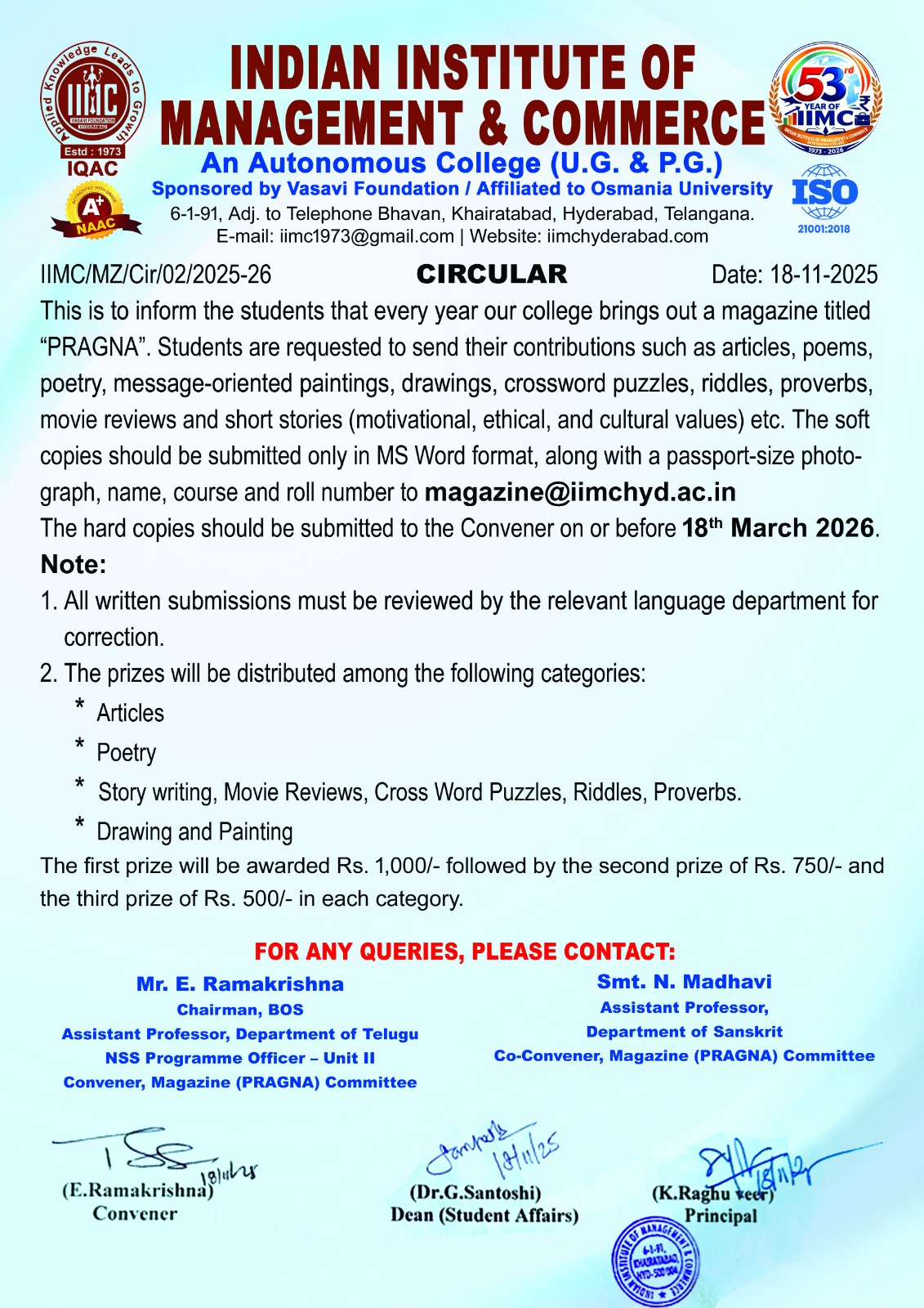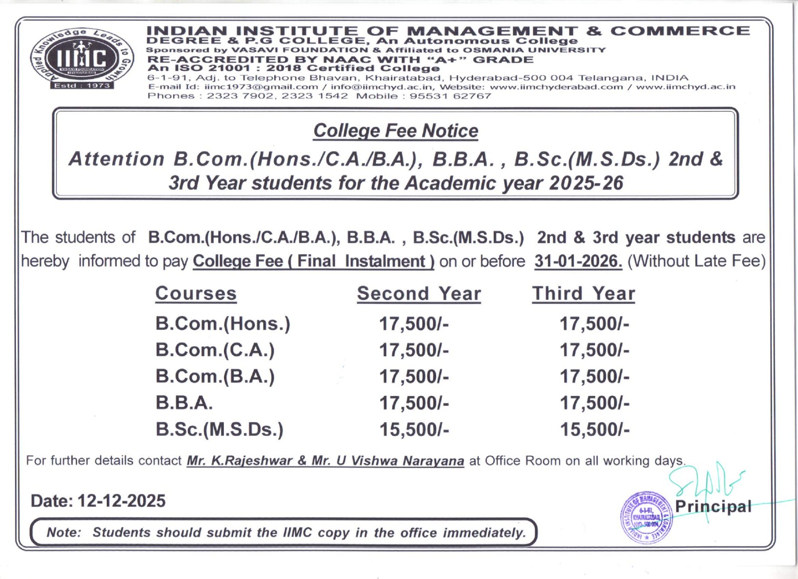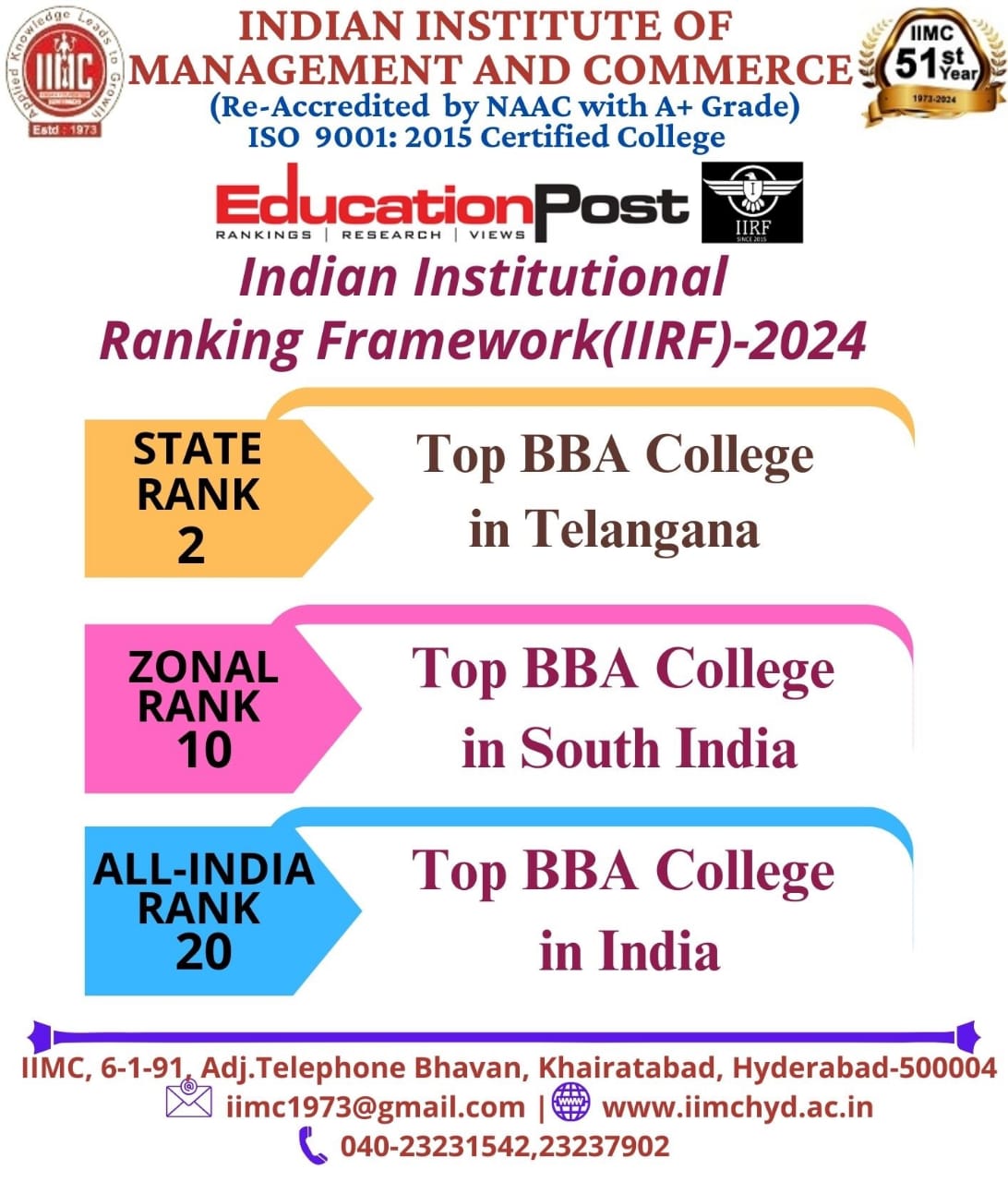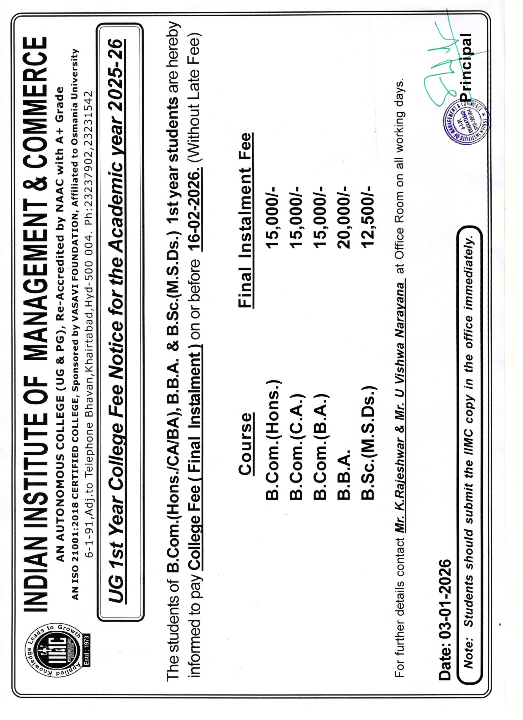 The Indian Institute of Management and Commerce(IIMC) established five decades ago(year 1973) has to its credit some outstanding achievements in the field of Commerce Education in general and Honours course in particular at the Degree level. Eminent social workers and philanthropists and Educationalists like Sri Kothuru Seethaiah Gupta, Sri Challa Som Raj Ram, Sri C.E. Gupta, Sri Dundoo Balanarasaiah, Sri Narayana Chetty IAS(Retd.), Late Sri Veloor Lingaiah Gupta gathered together and laid solid foundation in starting this premier Institution. Members of Vysya Community in particular and admirers of Higher Education in general are greatly beholden to the Founders.