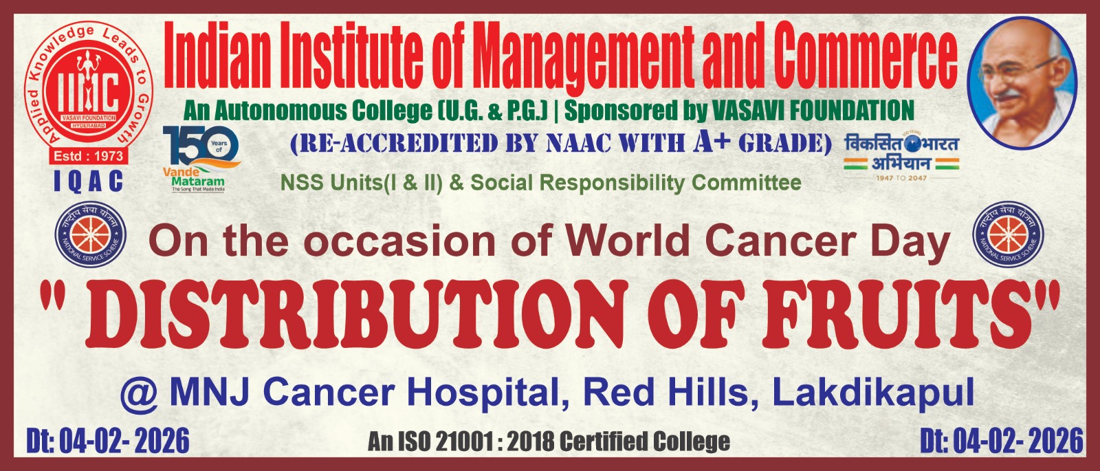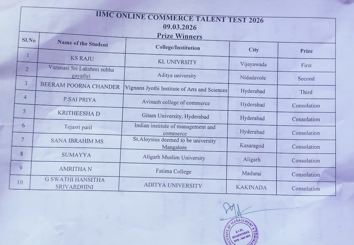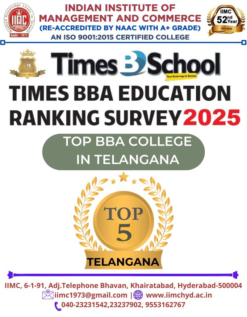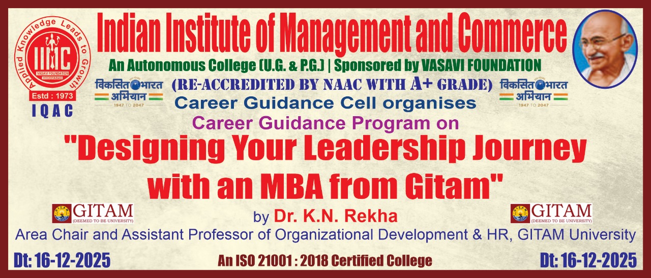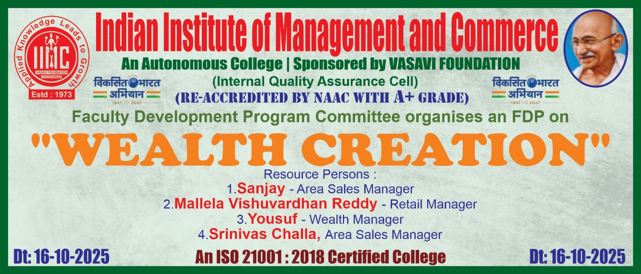 The Indian Institute of Management and Commerce(IIMC) established five decades ago(year 1973) has to its credit some outstanding achievements in the field of Commerce Education in general and Honours course in particular at the Degree level. Eminent social workers and philanthropists and Educationalists like Sri Kothuru Seethaiah Gupta, Sri Challa Som Raj Ram, Sri C.E. Gupta, Sri Dundoo Balanarasaiah, Sri Narayana Chetty IAS(Retd.), Late Sri Veloor Lingaiah Gupta gathered together and laid solid foundation in starting this premier Institution. Members of Vysya Community in particular and admirers of Higher Education in general are greatly beholden to the Founders.