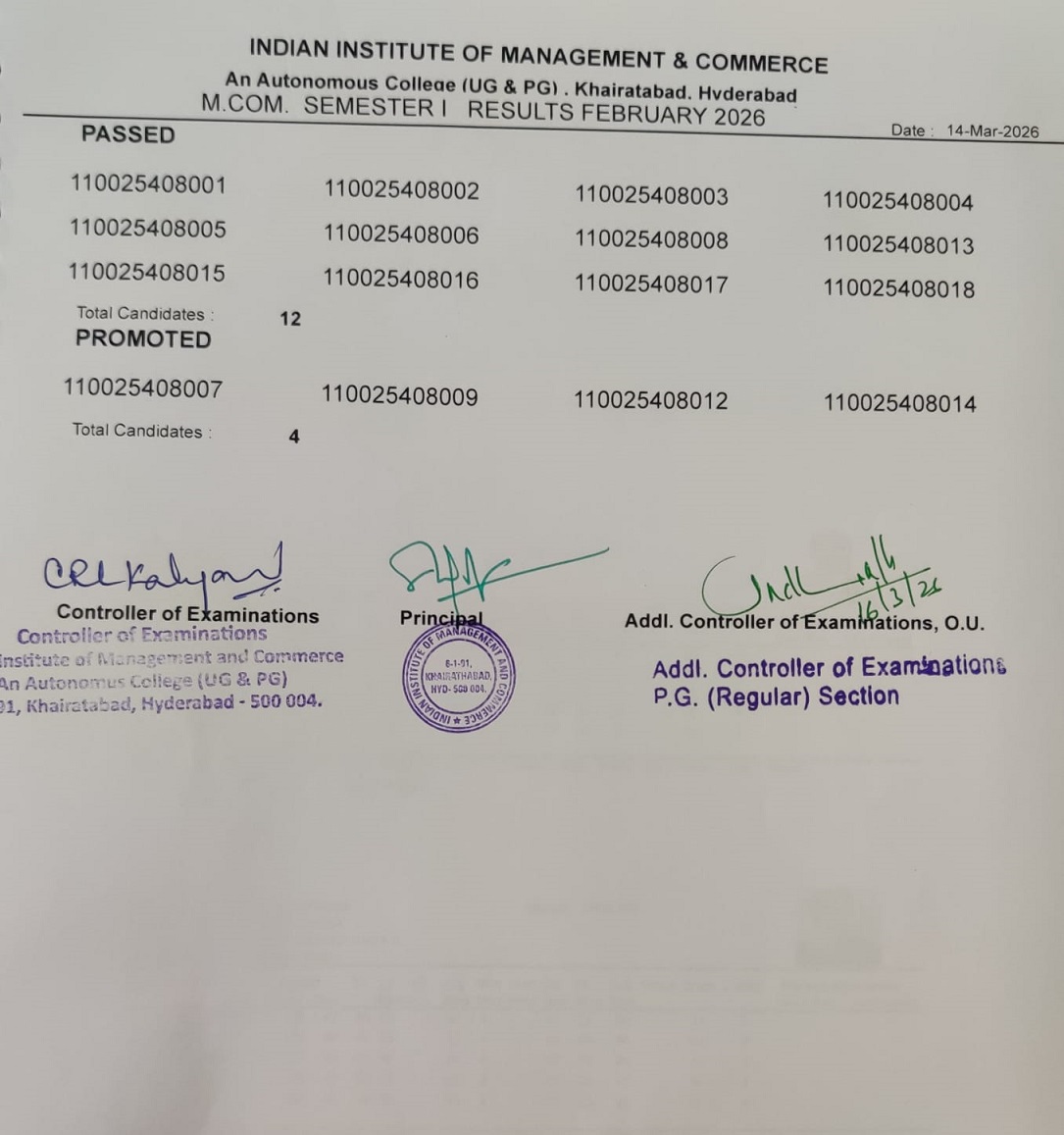 • The Indian Institute of Management and Commerce(IIMC) established five decades ago(year 1973) has to its credit some outstanding achievements in the field of Commerce Education in general and Honours course in particular at the Degree level. Eminent social workers and philanthropists and Educationalists like Sri Kothuru Seethaiah Gupta, Sri Challa Som Raj Ram, Sri C.E. Gupta, Sri Dundoo Balanarasaiah, Sri Narayana Chetty IAS(Retd.), Late Sri Veloor Lingaiah Gupta gathered together and laid solid foundation in starting this premier Institution. Members of Vysya Community in particular and admirers of Higher Education in general are greatly beholden to the Founders.