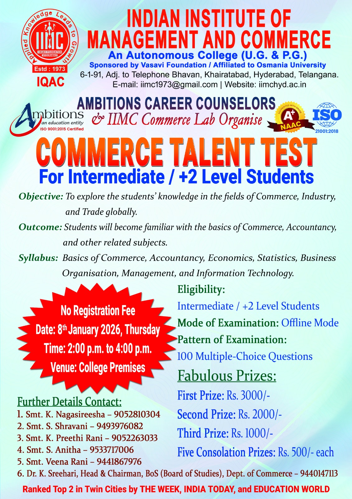 The Indian Institute of Management and Commerce(IIMC) established five decades ago(year 1973) has to its credit some outstanding achievements in the field of Commerce Education in general and Honours course in particular at the Degree level. Eminent social workers and philanthropists and Educationalists like Sri Kothuru Seethaiah Gupta, Sri Challa Som Raj Ram, Sri C.E. Gupta, Sri Dundoo Balanarasaiah, Sri Narayana Chetty IAS(Retd.), Late Sri Veloor Lingaiah Gupta gathered together and laid solid foundation in starting this premier Institution. Members of Vysya Community in particular and admirers of Higher Education in general are greatly beholden to the Founders.